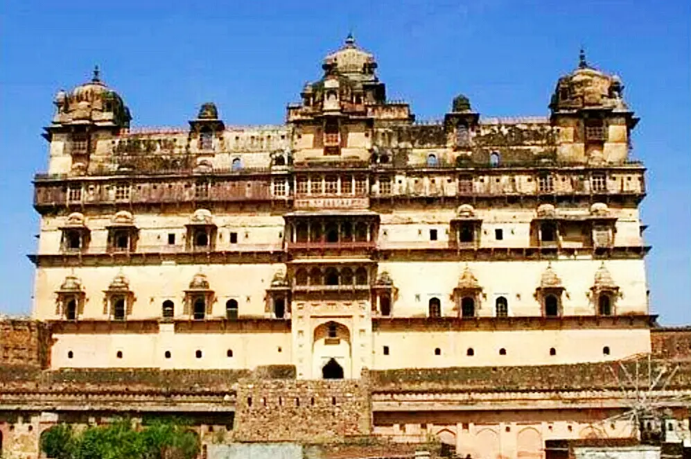 Veer Singh Palace, Datia (M.P.)- झाॅंसी से 28 किमी॰ दूर स्थित दतिया नगर ( ने॰हा॰-75 ) की पश्चिमी दिशा में एक टीले पर स्थित आलीशान सतखण्डा महल दूर से ही दतिया की पहचान कराता है। वीर सिंह जू देव महल का निर्माण बुन्देला काल का है। यह सम्पूर्ण राजभवन बुन्देली स्थापत्य कला का जीवन्त प्रतीक है। महल का निर्माण चूना तथा पत्थर से हुआ है। ग्रेनाइट की चट्टानों को काटकर भवन निर्माण का धरातल तैयार किया गया। इस भवन की पाॅंच मंजिलें है, बीच में बड़ा आंगन है। टेकदार छज्जे, झरोखेदार खिड़कियाॅं, बेलबूटे और पच्चीकारी सब मिलकर महल स्थापत्य का निखार उभर कर सामने आया है। पूरे महल में आयताकार वर्गाकार कमरों तथा सीढ़ियों का सिलसिला प्रति साम्य के कारण भूल-भुलइया जैसा है। महल का पूर्वोन्मुखी पाश्र्व सबसे अधिक भव्य और आकर्शक है। ढलान लिए गुम्बदों तथा कलात्मक झंझरी एवं जालियों से युक्त वातायन और झरोखों की आकृति लुभावनी है। किले के कोट की ऊॅंचाई 40 फुट और लम्बाई एक मील है। कोट में ऊॅंचाई पर तीरकश बने हुए हैं जिनसे होकर युद्ध में तीर या गोली चलाई जाती थी। बाहर बुर्ज की दीवारों और छतों के भीतरी भाग में कई प्रकार के बेलबूटे विभिन्न रंगों में बने हैं। हाथी पर खड़े होकर भी ऊॅंचाई तक न पहॅंुचने वाले किले के प्रवेश द्वार में काफी मोटे और मजबूत लकड़ी के किबाड़ लगे हुए हैं, जिनमें ऊपर से लेकर नीचे तक लगभग 1-1 फुट की दूरी पर मोटे तथा नुकीले ‘हाथी चिक्कार’ लोहे के कीले लगे हुए हैं।