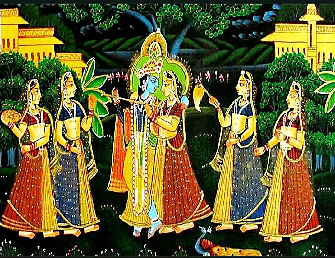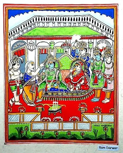 वस्त्र- राजस्थानी शैली में पुरुषों के लिए जामा, पटका, पगड़ी तथा स्त्रियों में चोली, लहंगा और ओढ़नी आदि वस्त्रों का प्रयोग हुआ हैै। मुगल शैली में जामा, चुस्त पाजामा, कमर में पटका तथा पगड़ी का प्रयोग हुआ है। स्त्रियां भीना आंचल, कुर्ता या आस्तीनदार चोली, पाजामा तथा लहंगा पहने हुये हैं। वहीं दूसरी तरफ बुन्देली शैली में पुरुष कतैया, गरगा व पगड़ी तथा स्त्रियां 3 या 7 कली का लहंगा के ऊपर चुन्नी (कुछ हिस्सा खोसा हुआ), चोली व कांछदार धोती पहने हुए हैं।