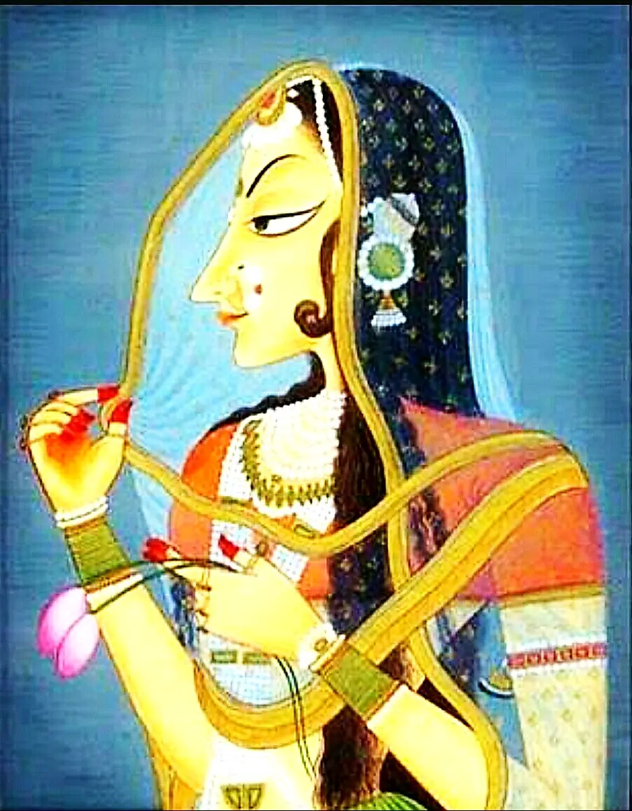 आकृति– राजस्थानी शैली में एक चश्म गोल चेहरे, नाक लम्बी, अजंता के कलाकारों से प्रभावित आकृतियां। मुगल शैली में एक चश्म चहरे का प्रयोग हुआ है। वहीं दूसरी तरफ बुन्देली शैली में दो चश्म तथा पौने दो चश्म चेहरों का प्रयोग है। ऊॅंचाई सिर की छः गुना (खजुराहो जैसी)।