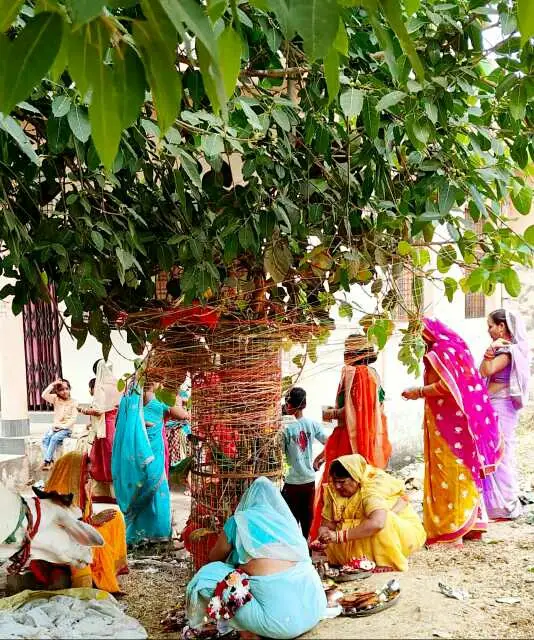 वट के मूल में ब्रह्म, मध्य में विष्णु, ऊपर शिव और समग्र में सावित्री हैं। सती सावित्री के सम्मान में यह व्रत रखा जाता है। हाथ में भीगे चने लेकर कथा सुनती हैं, फिर फल श्रृंगार का सामान एक दूसरे को बांटती हैं।
