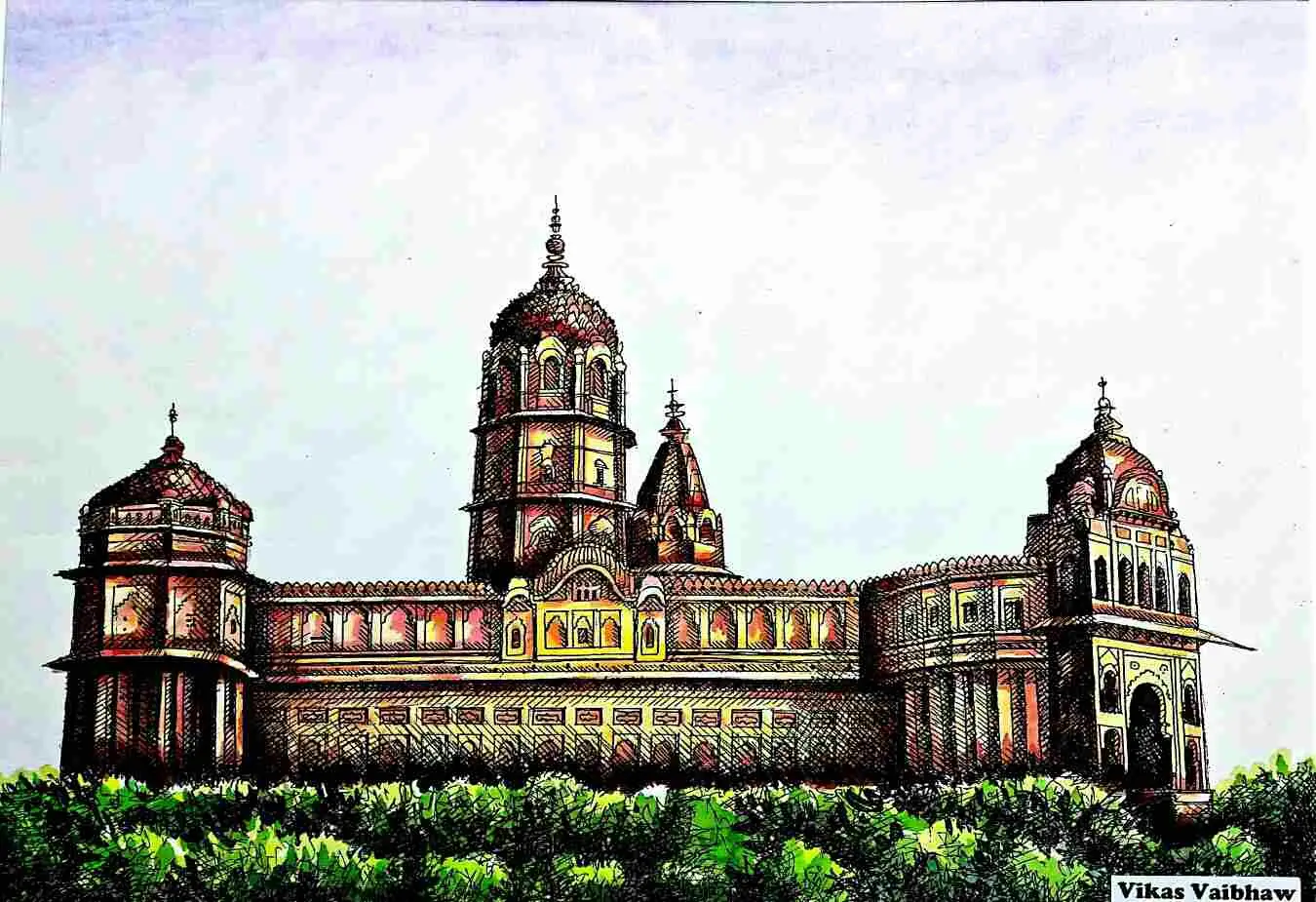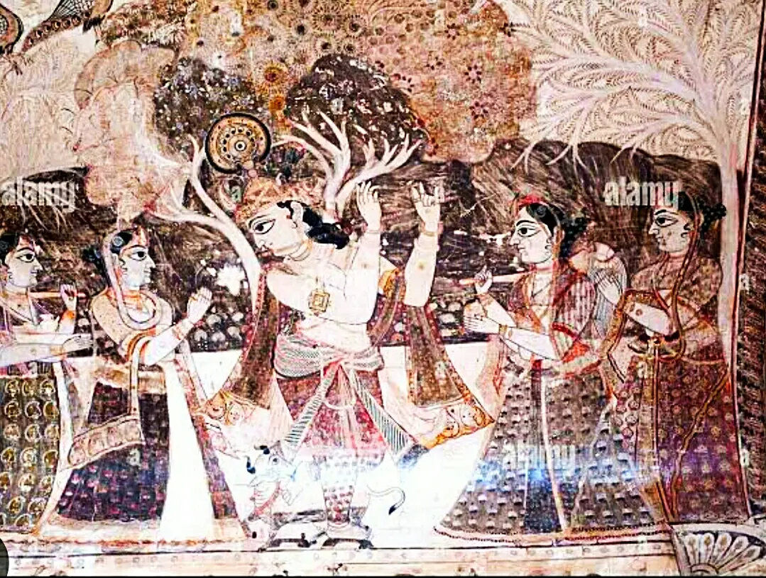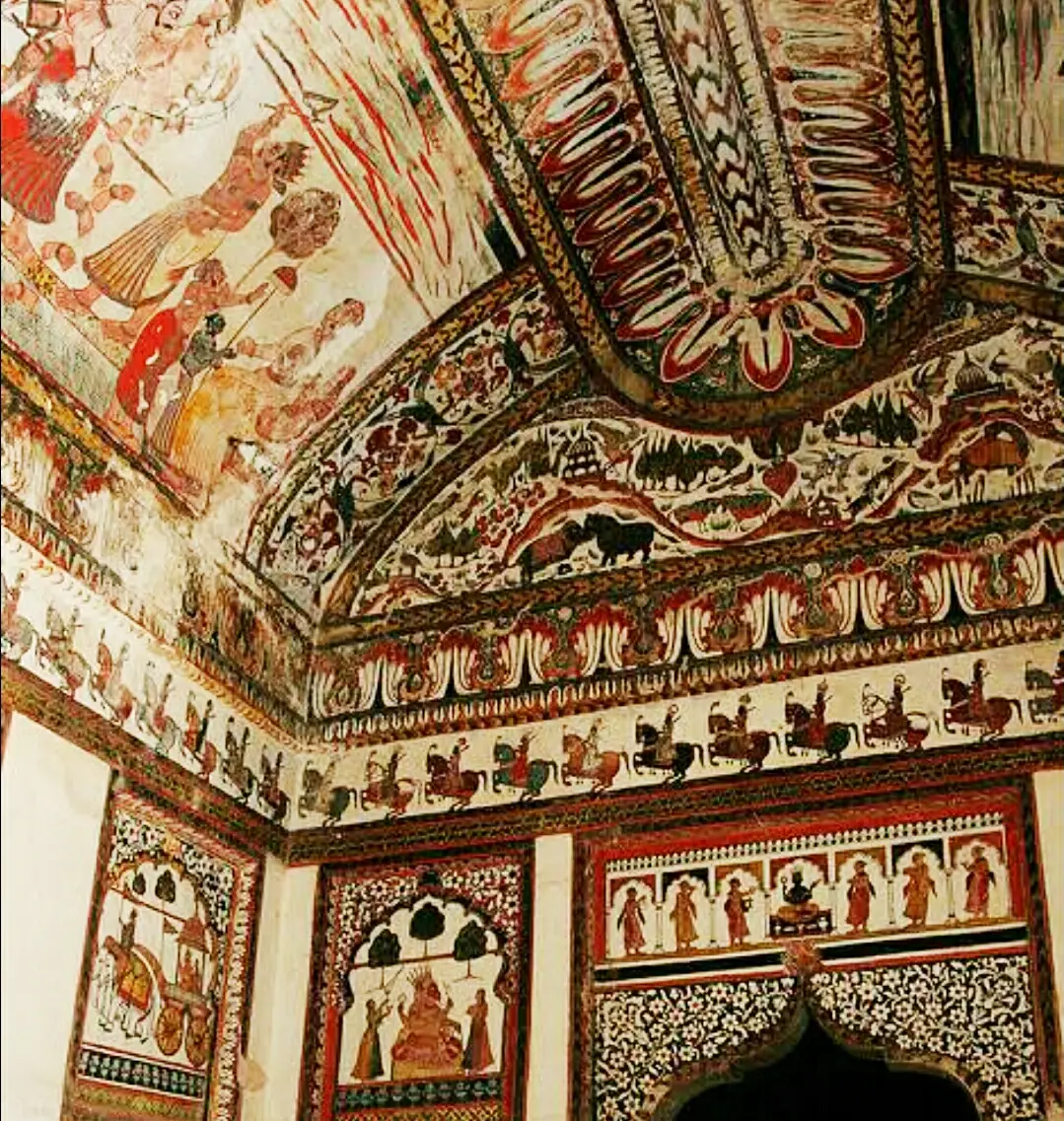 पूर्वी दालान में राम कथा, राज महल एवं शिकार दृश्य चित्रित है। दक्षिण में रासलीला, गज- लक्ष्मी, गजेन्द्र मोक्ष, भैरव व पंचमुखी शिव चित्रित है। पश्चिम में गज-लक्ष्मी, दुर्गा, हनुमान, कृष्ण, विष्णु व शिकार के चित्र बने है। राजाओं के चित्रों में क्षत्रियों जैसी दाढ़ी मूछों तथा आखों में ओज का प्रदर्शन जितनी सजीवता से हुआ है, उतना ही धार्मिक चित्रों में भाव प्रधानता, मौलिकता तथा जीवन्तता के दर्शन होते हैं। मन्दिर के मुख्य द्वार पर उत्कीर्ण आलेखन व चित्र भी अपने प्रकार के अलग ही हैं। इन आलेखनों व चित्रों में कत्थई पृष्ठभूमि पर सफेद रेखांकन है।